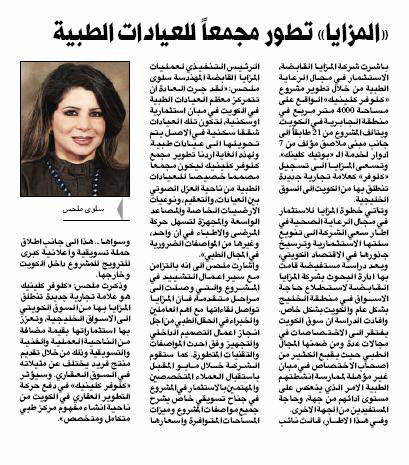 Eng. Salwa Malhas, Executive Vice President at Al Mazaya Holding, is quoted as saying: “In Kuwait, health care centers are originally residential or commercial buildings that are later transformed into clinics. With this in mind we developed “Clover Clinics”, a project that offers numerous features that cater specifically to the needs of health care specialists. This includes features such as sound isolation, sterilization facilities, quality flooring and wide elevators that ease the movement of both doctors and patients.”