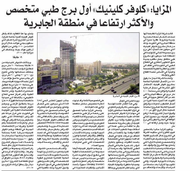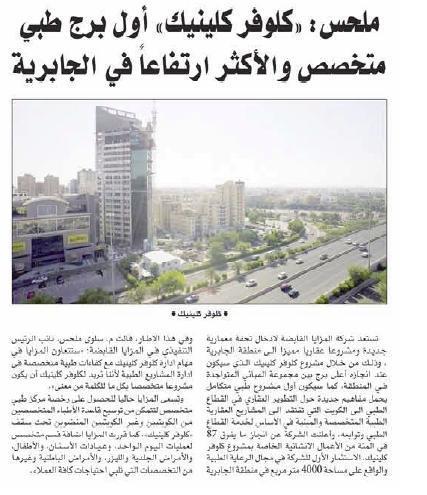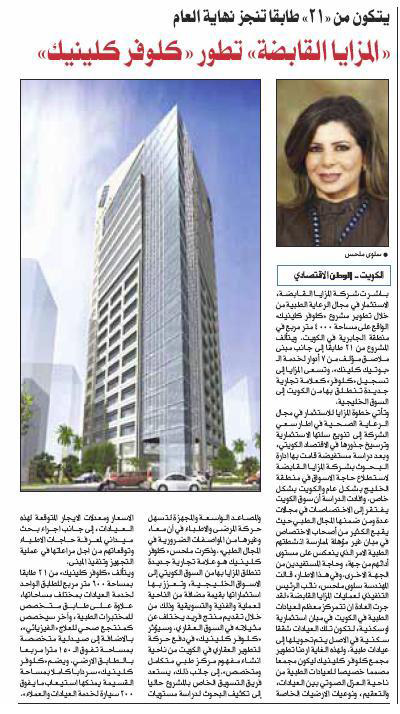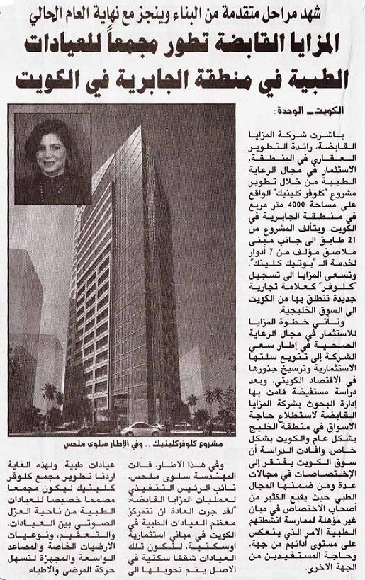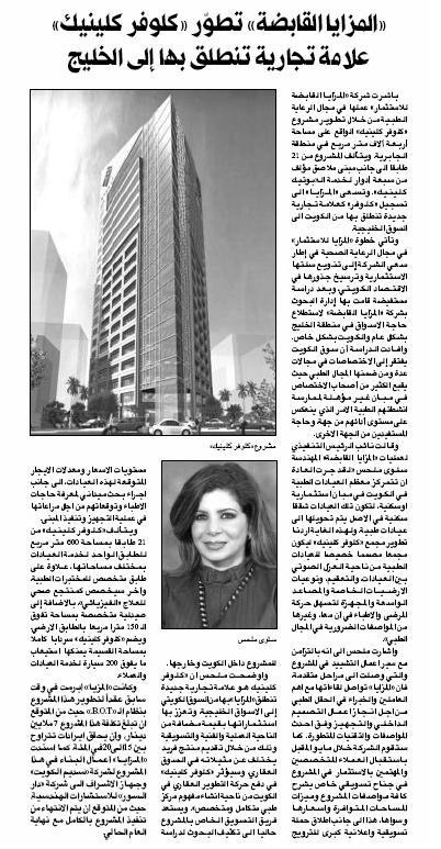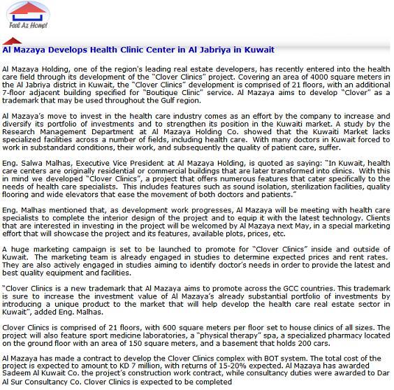 Al Mazaya Holding, one of the region's leading real estate developers, has recently entered into the health care field through its development of the “Clover Clinics” project. Covering an area of 4000 square meters in the Al Jabriya district in Kuwait, the “Clover Clinics” development is comprised of 21 floors, with an additional 7-floor adjacent building specified for “Boutique Clinic” service. Al Mazaya aims to develop “Clover” as a trademark that may be used throughout the Gulf region.