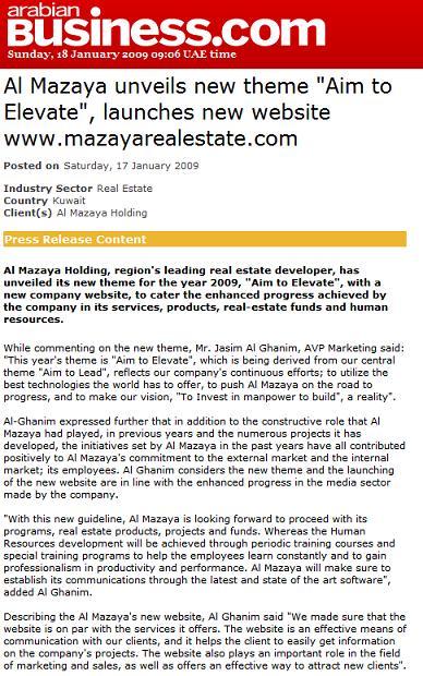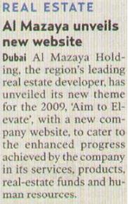 Al Mazaya Holding, region’s leading real estate developer, has unveiled its new theme for the year 2009, "Aim to Elevate", with a new company website, to cater the enhanced progress achieved by the company in its services, products, real-estate funds and human resources.
